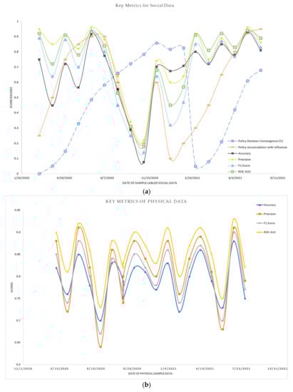 Figure 7a,b shows our evaluation assessing various performance metrics such as accuracy, precision, F1 score, and ROC AUC at different time points. In Figure 7a, our analysis showed that the decision convergence was generally high across all locations and time points, with an average convergence rate of 67%. We found that policy accumulation with influence played a significant role in determining the model’s performance metrics. A higher influence score was associated with better accuracy, precision, F1 score, and ROC AUC, indicating the importance of cooperation and attention-based analysis for optimal decision making. The model’s performance in New York was outstanding, with accuracy up to 0.95 and an F1 score up to 0.91 with an average of 0.69 for different sampled periods. In Florida, the model’s performance was relatively good, with accuracy and F1 scores ranging from 0.64 to 0.88. Our analysis has important implications, as it highlights the importance of incorporating policy accumulation with influence, cooperation, and attention-based analysis in decision-making models. These models can be effective at managing the spread of infectious diseases across different locations and infection states. Figure 7b depicts the results of the key metric analysis based on the physical data, where the average accuracy was found to be 87%. Notably, the figure reveals periodic dips in accuracy, which were caused by the accumulation of influence data in the algorithm policy-determination process.