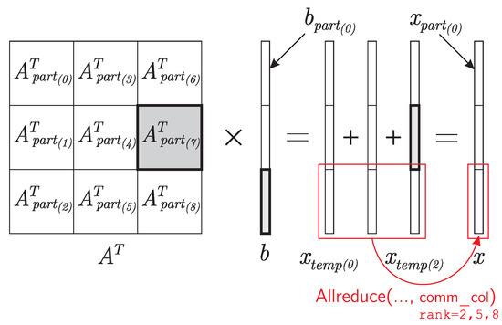 Thus, it is assumed that each MPI process contains the array A_part, which contains one of the parts of matrix A. In addition, each process contains arrays x_part and b_part, which contain one of the parts and of vectors x and b, respectively. The storage structure of the vectors x and b on different processes is also shown in Figure 2. It is clearly seen that the part of the vector x for a fixed index n is stored in all cells of the process grid column with index n. Similarly, the part of vector b for a fixed index m is stored in all cells of the process grid row with index m.