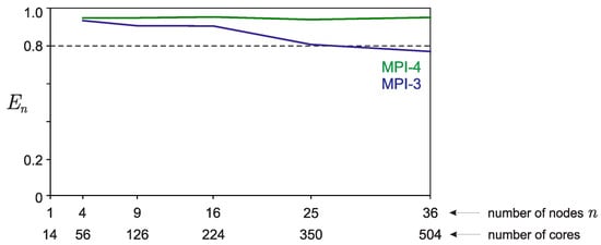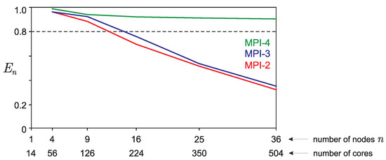 Thus, the weak scalability test was performed by simultaneously increasing the problem size (, , ) and the number n of processes involved in the computation. Figure 7 shows graphs of the parallelization efficiency depending on the number of computing nodes n involved in the calculations. As can be seen from the presented graphs, the proposed software implementations of the algorithm have the property of weak scalability. This again shows the advantage of using the MPI-4 standard.