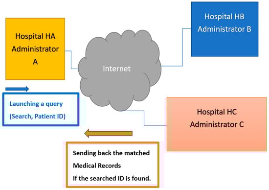The strawman protocol for providing symptom retrieval is used and monitored by the administrator, A, of a hospital HA’s EMRS. For convenience, hereafter, we will not indicate the name of the responsive hospital but directly refer the corresponding EMRS to the administrator’s name, A. Therefore, the task of transmitting patients’ ID numbers from hospital HA to other Hospitals, say Hospitals HB, HC, and HD, can be represented by the information flow diagram shown in Figure 1. If Hospitals HB and HC did have the relevant medical records of the searched patients, administrators B and C would send the related symptoms back to administrator A, respectively.