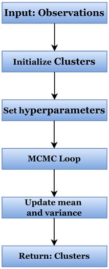Based on all the preceding information, we propose a Bayesian nonparametric clustering method within an MCMC framework. This is illustrated as a flowchart in Figure 1, while the full inner structure is given in Algorithm 1. The algorithm initiates by inputting the y observations and , m hyperparameters as well as the MCMC iterations of the program. The outputs of the algorithm are the K clusters as well as their means and variances.