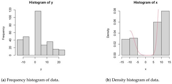 In this section, we present the experimental results based on the methods from the preceding sections. Figure 2a shows the frequency histogram of y observations of the data, while Figure 2b shows the histogram of x and the density of the data.