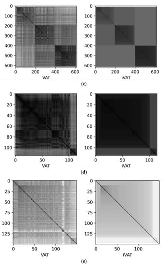 To highlight the internal structure of the data in this work, we used the algorithms for visual assessment of the tendency to clustering VAT/iVAT [29]. The VAT/iVAT algorithms are tools for visually evaluating the clustering tendency of a set of points by reordering the dissimilarity matrix so that possible clusters appear as diagonal dark boxes on a cluster heatmap. This cluster heat map can be used to visually estimate the number of clusters in a dataset [29]. For the datasets used, heat maps are shown in Figure 1. Analysis of heat maps allows you to visually identify groups of clusters, the number of which corresponds to the labels of the original data.