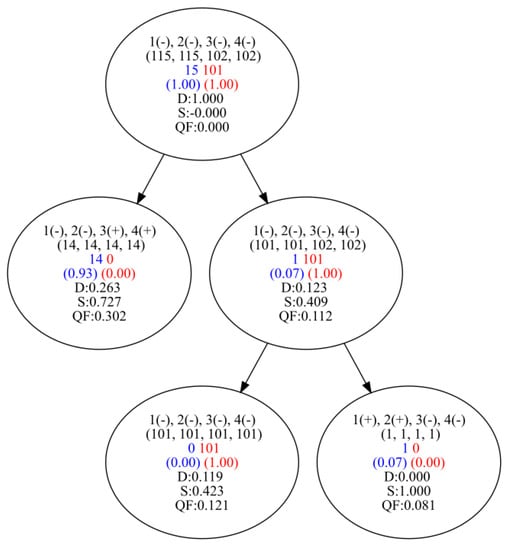 where α is a parameter, N is the total number of objects, p is the number of positive objects, NSG is the number of objects in the allocated subgroup, and pSG is the number of objects of the prevailing class in the allocated subgroup. QF uses α to weight the relative of a subcluster. According to [48], in the experiments, we used the value α = 0.5.