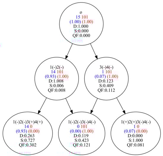 Analyzing the obtained concept lattices (Figure 2, Figure 3, Figure A1, Figure A2, Figure A3, Figure A4, Figure A5 and Figure A6), it can be observed that the number of logical concepts obtained using FCA is greater than the number of concepts in the lattice constructed with COBWEB. However, it should be borne in mind that the FCA-based approach to identifying logical concepts can be formalized for subgroup sets, allowing for overlap between the subgroups. This does not apply to the lattice of concepts generated with COBWEB, wherein subgroup intersections are not allowed.