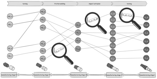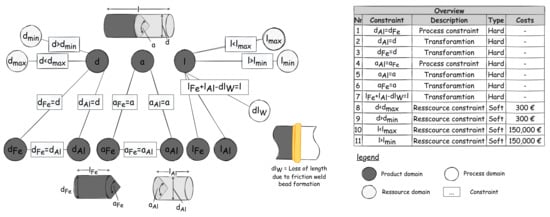 To enable the subsequent reasoning process (see Section 6), the modeling of the constraint network within the process containers follows a fixed scheme. When modeling constraints, CSP distinguishes between hard and soft constraints. Hard constraints represent the geometric transformations and physical or process-related restrictions that must not be violated. Thus, hard constraints define fixed limits for the manufacturable solution space for a precast geometry as the set of all possible manufacturing stage configurations. The soft constraints represent target requirements with which this solution space can be additionally restricted, starting from the available manufacturing resources. To model a process, the shaping characteristics of two successive manufacturing stages are linked via explicit binary hard constraints or higher order hard constraints. In this process, the shape change of the manufacturing stages can be modeled. The CSP must be designed in such a way that the consideration of all hard constraints results in at least one valid solution. In order to investigate the manufacturing suitability of the manufacturing stages, additional geometry-restricting manufacturing constraints are formalized within the process containers as binary soft constraints related to the manufacturing stages to be restricted. The soft constraints consist of a product-related (left side of the constraint) and a resource-related (right side of the constraint) side. At this point, resource-related manufacturing capabilities are integrated with available manufacturing resources. In addition to the soft constraints, potential costs for the purchased production resource are also stored, which arise in the case of a new procurement or adaptation. This later allows for a cost-oriented specification of manufacturing resources to achieve the manufacturability of a component. Figure 4 shows the modeling for the process container of a friction welding process to produce a multi-material semi-finished product.