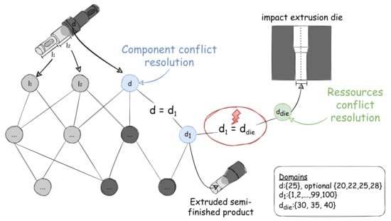 - Finally, the case with the highest similarity value is selected and transferred to the impact extrusion process container. Within the impact extrusion process container, the geometry of the previously joined surface , the forming degree , and the shoulder angle of the impact extrusion die , among others, are formulated as variables. These variables could now be identified by case-based reasoning and must be provided to the constraint network. There are two ways to do this. On the one hand, additional soft constraints can be formulated, which require an equality condition between the identified parameters and the variables created in the process container. This has the advantage that the soft constraint is taken into account in a possible conflict search (see Section 6). On the other hand, the identified parameters can be inserted directly into the domains of the variables. Thus, there is an advantage in terms of computation time, since the possible solution combinations are restricted in advance. However, these variables cannot then be considered in the conflict search. In this paper, the second option was used. With this three-part approach, it is now possible to consider the knowledge from a case base within a CSP.