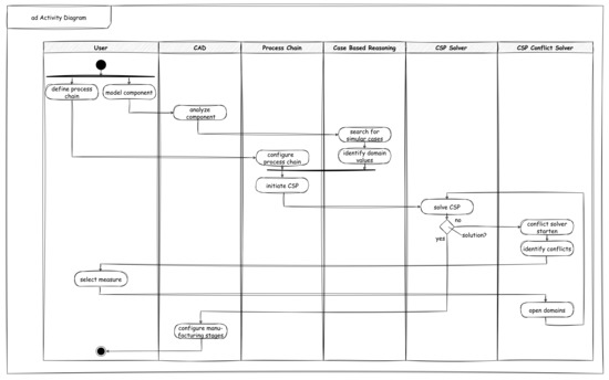 The system architecture and implementation of a knowledge-based system are crucial to create a robust and reliable assistance system. In this context, Python is one of the preferred programming languages because it is used by many developers, it allows for the integration of a large number of external libraries, and it has an interface to commercial CAD systems. Therefore, the entire system is computer-implemented in Python. To describe the system architecture and implementation, Figure 10 lists the activities for implementing the manufacturing stage model in a flowchart. Here, the user starts by manually building a CAD model for the tailored-forming part under investigation. At the same time, the user defines the manufacturing process chain with the part shape and specifies which process steps form the process chain in which order. The user interacts via a web-based interface hosted on a Flask server [51], which enables a user-friendly deployment within the development process.