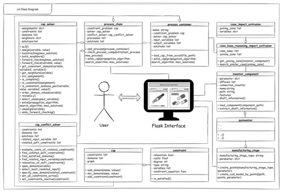 Based on this, a CAD module examines the geometry model of the tailored-forming component under investigation and reads out the relevant geometry parameters as well as the joining zone design. For this purpose, the CAD system Autodesk Inventor is used, since this system has an extensive interface that can be controlled with Python. Alternatively, other CAD systems can be used that have a similar interface. The joining zone information is then provided to a case-based reasoning module. This module searches for similar designed joining zones within an empirical or simulated case base and identifies feasible value assignments for some domains. With this and the previously defined process chain, the process chain configuration problem is built as a CSP within a process chain module. For this, the necessary variables with their domains as well as the constraints are created in the CSP and the domains are set according to the results from the case-based reasoning. The initiated CSP is then solved with a CSP solver module. This module considers different algorithms for constraint propagation and solution search. If a solution is found that satisfies all constraints, the identified value assignments are returned to the CAD module. By linking to the CAD system Inventor, the configured manufacturing steps can be modeled and made available to the user as a download via the Flask interface. If no solution is found by the CSP Solver module, the CSP Conflict Solver is activated. It identifies the conflicting constraints and resolves these conflicts by opening the domains of the involved variables either on the resource or on the component side. This expands the solution space and CSP Solver module starts solving the CSP again. The decision of whether to solve on the component or resource side is made by the user. The domains can also be opened step-by-step to avoid high computation time in case the domains are too large. This process for conflict resolution can be performed several times to identify alternative solutions. After the program flow was introduced with Figure 10, the implementation of the five modules is discussed. An object-oriented approach is pursued, since this makes a high modularity possible by independent program units, as well as the reuse of classes and functions as well as the inheritance of classes and thus the maintainability and expandability of the program facilitates. The conversion of the modules into responsible classes can be taken from the class diagram in Figure 11. These are introduced in the following after the modules.