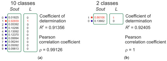 There is only one disadvantage to using this metric, which is that it has a significant discreteness of value, which is especially noticeable when using a small dataset. If there are 100 vectors in the test dataset, then the precision value is limited to two decimal places (e.g., 0.55, 0.62, 0.99). In this paper, we present two more classification metrics that evaluate the efficiency of the classification algorithm by analogy with regression problems. These precision values have many significant digits after the decimal point. Figure 2 is presented for clarification. There is a data vector in the output layer of the classifier Sout, and a label vector in the training dataset L. A Pearson correlation coefficient (p) (Equation (2)) or a determination coefficient (R2) (Equation (3)) is calculated for each pair.