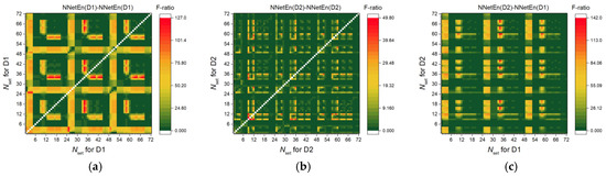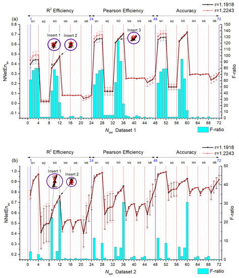 In Figure 17, F-ratio distributions for Dataset 1 (Figure 17a) and Dataset 2 (Figure 17b) are shown based on the settings number and channel. The best reservoir filling methods for Dataset 1 are M3, M4, and M5, and for Dataset 2 M1, M3, and M4. In Dataset 1, channels 7, 8, 10, 11, 12, and 15 provide the best signal recognition, while in Dataset 2, channels 7, 9, 10, 13, 15, and 16 provide the best signal recognition.