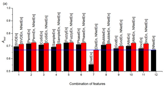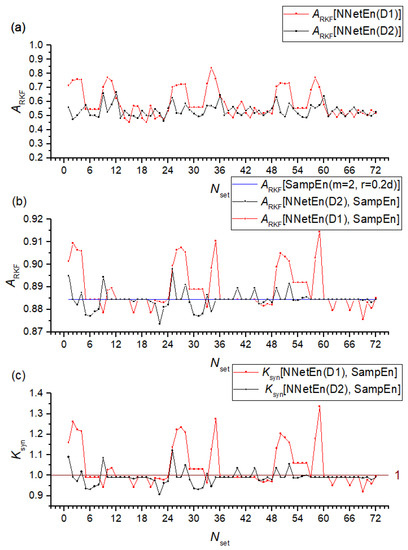 In terms of the single feature, NNetEn generally performed quite well in comparison with other entropies. The synergistic effect of standard entropies with NNetEn(D1,1, Nset = 60) is shown in Figure 18. A synergistic effect was observed when almost all entropies were paired with NNetEn, increasing the total ARKF value (Figure 18a). The dependence of Ksyn on pair type can be seen in Figure 18b. The most effective synergistic effects were observed for IncEn, AttnEn, SampEn, and SVDEn.