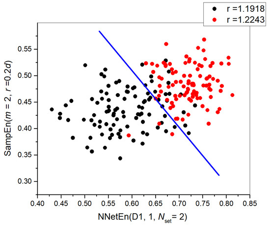 The NNetEn’s ability to differentiate signals was investigated on synthetic signals based on sinus mapping. In addition, we analyzed the EEG recordings obtained at AHEPA General Hospital of Thessaloniki’s Department of Neurology [37]. Information on the functioning of the human brain can help to develop such tools as human-machine interface (HMI) and clinical diagnosis systems (CDS) [38]. Besides analyzing cognitive processes (emotional state, mental fatigue level, emotional stress, mental health), it is possible to detect the presence of a number of neurological diseases (epilepsy, Alzheimer’s disease, attention deficit/hyperactivity disorder, bipolar disorder, etc.) [38]. In order to classify EEG signals, it is necessary to extract features from the original EEG signal. Methods to extract features include spectral analysis [39], wavelet analysis [40], entropy [41], statistical analysis [42], and others. Following the feature extraction, signals are classified using machine learning algorithms, such as a nearest neighbor method, a support vector machine, a decision tree, a random decision forest, neural networks, etc. [38,43]. In this paper, the robustness of NNetEn feature in analyzing EEG signal is investigated by considering AHEPA dataset. The AHEPA dataset includes electroencephalograms from 88 patients divided into three groups: control group (29 people), dementia (23), and Alzheimer’s disease patients (36 people). Later, the NNetEn extracted from the above dataset has been processed and classified through a conventional machine learning algorithm (Support Vector Machine (SVM)). The performance of the NNetEn feature was analyzed with other conventional entropy measures. In addition to the existing accuracy metrics [44,45], we have developed two alternative classification accuracy metrics using R2 and Pearson coefficients (R2 Efficiency and Pearson Efficiency) to assess the performance of the NNetEn.