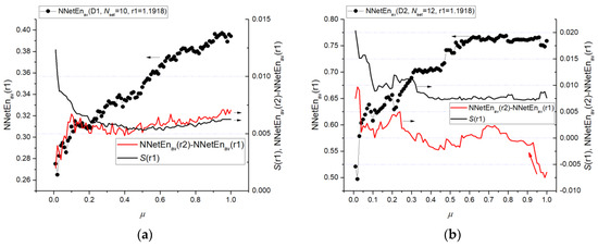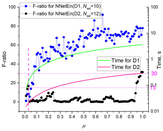 In the study of NNetEn, we also measured the dependence of the signal separation efficiency on the database usage fraction μ. For example, μ = 0.01 means using 600 samples for training and 100 samples for testing for Dataset 1, and 53 samples for Dataset 2. Varying this parameter allows you to vary the entropy calculation time and its functionality.