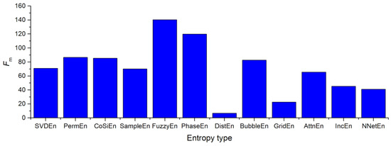 In order to determine the optimal method for calculating entropy using A3 coefficients, the following entropies were tested: SVDEn, PermEn, SampEn, CoSiEn, FuzzyEn, DistEn, PhaseEn, BubbleEn, AttnEn, IncEn, NNetEn. The Fm values for various entropies are shown in Figure 15. In order to maximize Fm, the entropy parameters were chosen in a manner that maximized the value of Fm. In this case, FuzzyEn Fm = 140 seems to produce the best results. It is found that all three methods (SampEn, CoSiEn, FuzzyEn) yield a relatively high result when vectors that are similar to the built-in matrix are taken into consideration. The worst result comes from DistEn—Fm = 6.8. NNetEn shows that there is a sufficiently good separation of the signals from healthy and sick patients at Fm = 40.29.