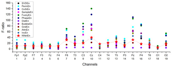 In Figure 16, the best F-ratio values for different entropy methods are shown for each channel. It was found that channel number 10 (Cz) was the most significant among the channels processed. Additionally, good separation can be observed in channels 7 (F8), 9 (C3), 15 (Pz), and 16 (P4). On channels 5, 11, 12, 13, and 18, NNetEn ranks among the leaders in terms of feature strength, and on channel 11, it shows the best results.