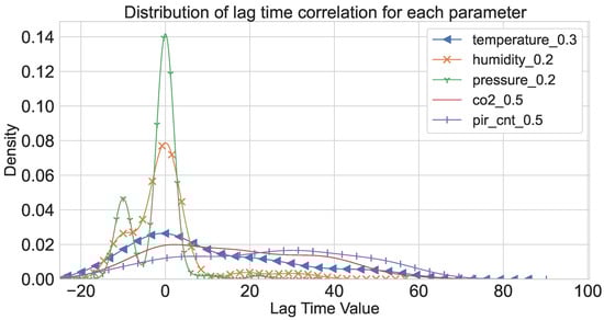 The analysis that follows is conducted on a single room denoted by room00, which fits 12 people. The lag time distribution with respect to each dataset when the correlation between CO2 and other features is below a certain threshold is displayed in Figure 1. This calculation allows inferring the time window whereby a lagged feature can explain the changes in CO2 concentrations. The correlation thresholds involved are with a 0.1 increment. If the threshold is not found, meaning the dataset has a higher correlation than the threshold, a value of −10 is returned to emphasize the distinction in the distribution figure.