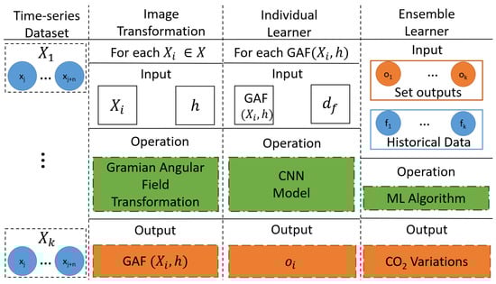 This section describes the steps applied to obtain accurate predictions of the variations in CO2 concentrations over a future time window. Figure 2 depicts the methodology referred to as the HMCOVP, such that each practical step is detailed based on the input to this step, the operation taking place, and its output. The following subsections explain each step of predicting CO2 variation direction and predicting CO2 variations. Time-series to Image Transformation and CNN Individual Learners are the building blocks to predict the CO2 future direction. Outputs of decreasing CO2 variation direction and ensemble learners are the foundations for CO2 variation predictions.