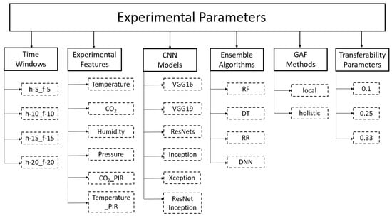 Experimental Features: The original dataset consists of five environmental features: pressure, temperature, humidity, CO2 concentration, and activity levels. The activity level or PIR is a categorical variable formed of 0.5 increments from 0 to 12, amounting to 25 variables. The PIR feature space is first reduced to four categories, each representing eight contiguous activity levels, except 0, which is a category on its own. The one-hot encoding schema would create many 0–1 variables, which cannot be transformed into an image representation. Therefore, the PIR feature is transformed into two features, denoted by temperature_PIR and CO2_PIR. These two features are chosen because they exhibit the highest correlation with the PIR feature. The quantities are obtained by calculating the ratio of CO2 and temperature to the PIR feature. Six environmental features are obtained following this feature engineering step that includes CO2, temperature, pressure, humidity, CO2_PIR, and temperature_PIR.