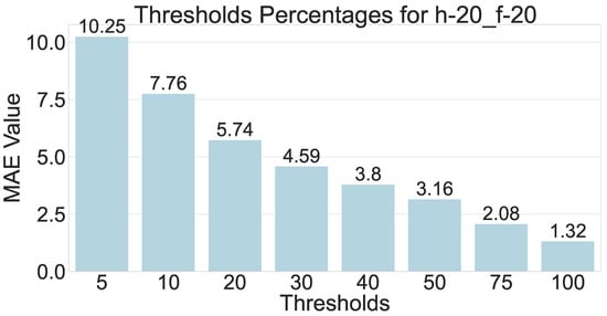 The summarized results in Table 2 have shown some parameter combinations that clearly outperform others. However, a clear limitation of the MAE parameter in this application is that it is skewed toward the values that constitute the majority of the response variable. In order to clarify this caveat, Figure 4 shows the percentage distributions of different absolute values of thresholds defined in the evaluation criteria. These results suggest that more than 60% of the variations are under 5 ppm. Therefore, a model with a low MAE is not fully representative of its performance on drastic changes in data. These radical changes are of higher importance for HVAC systems and building operators, but they are less common in the studied dataset. As a result, the crude MAE is replaced by a metric that averages the MAEs over each of the defined thresholds. This new metric is referred to as Thresh_MAE.