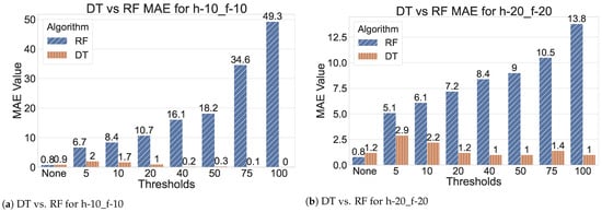 Figure 5 shows the differences in MAE for each of the defined thresholds for the two best-performing models in Table 2 that use DT or RF for ensemble learning. Figure 5a shows that RF combined with the other parameters included in Table 2 outperforms its DT counterpart when no thresholds are imposed. However, the performances start to diverge with increasing thresholds until a huge gap in performance is prominent. This trend shows that the RF model performs well on small variations in CO2 while DT outperforms RF when more drastic changes are involved. A similar observation can be applied to Figure 5b, whereby DT outperforms RF when thresholds are considered. However, a notable separation exists between the results of the RF for higher thresholds with the expansion of the prediction time horizon. This discrepancy is attributed to the abundance of more extreme variations with the expansion of future time windows. This fact enables the models to better map the relationships between these extreme values and the input variables, manifested by the lower MAE for higher thresholds.