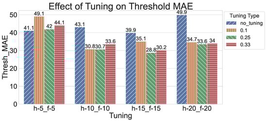 Figure 6 shows the effect of retraining the ensemble learner with different training sizes. The HMCOVP’s retrained ensemble model regressed in performance when applied to the h-5_f-5 combinations, regardless of the integrated training set’s size. This observation essentially suggests that the tuning process for this combination should incorporate individual models. On the other hand, a significant performance improvement is noted for all the other combinations. The greatest improvement is observed for the h-20_f-20 combinations, whereby its performance is the closest to the model applied to room00. For all the improved combinations, retraining the ensemble model with a quarter of the training set yields the best results. The results of these combinations show that incorporating the historical numerical values with the individual learners’ outputs contributes to performance enhancement. However, this alteration does not fully capture the dynamics of the target set, representing the small conference room. To mitigate the performance gap in CO2 variation predictions, the individual learners should be tuned the same as the ensemble learner. This aspect will be addressed in future work.