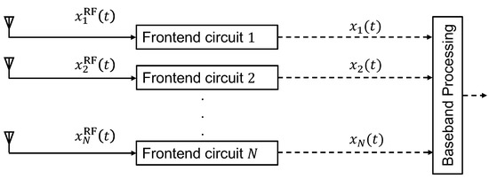 Figure 1 depicts the block diagram of the receiver antenna array of a massive MIMO system without performing compressed measurement. In this receiver array, each antenna is assigned with a dedicated front-end circuit, which converts the received analog RF signal to the digital base-band by performing down conversion and analog-to-digital conversion. However, dedicating a separate front-end circuit to each antenna in a massive MIMO system may be impractical, considering the hardware cost, power consumption, and computational complexity.