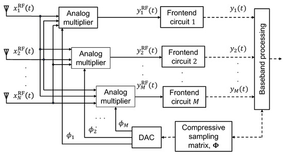 The number of antennas in a massive MIMO system is typically much higher than the number of users or targets. Consequently, the impinging signals can be considered sparse in the spatial (angular) domain. Such sparsity property allows us to design an optimal CMM that projects the array receive signal to a lower-dimensional manifold with no or negligible information loss. In this manner, the array receive signal can be compressed significantly in the analog domain as shown in Figure 2. As a result, the number of front-end circuits in the analog domain and the computation burden in the digital domain can be significantly reduced.