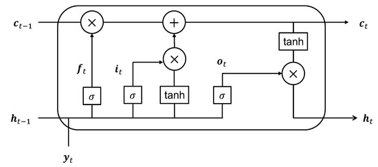 Figure 3 illustrates a unit of the proposed LSTM framework at time t. At this time instant, the input to the deep learning unit comprises the current compressed measurement and the cell and hidden states from the previous time samples, denoted as and , respectively. The LSTM unit has four gates, namely the forget gate (), input gate (), cell gate (), and output gate (), which respectively perform the following operations:
