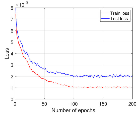 We evaluate the performance of the proposed model against two related approaches as described in [21,34]. The non-neural network approach presented in [21] optimizes CMM iteratively based on mutual information maximization, while the approach described in [34] uses an FCDNN to update the posterior distribution of the DOAs of the impinging signals. To compare these methods, we consider a test example with nine sources and their corresponding signal DOAs are , , , , 8°, 20°, 31°, 41°, and 45°. Figure 5 shows the estimated spectra obtained from the methods where the input SNR is 5 dB. As demonstrated in this figure, the proposed method, depicted in (a), shows a cleaner spectrum compared to [21,34], as illustrated in (b) and (c), in a low SNR scenario. Figure 6 demonstrates the reduction in the loss function as the number of epochs increases. It is evident from the figure that the model converged well within the first 200 epochs.
