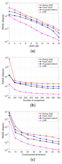 where Q is the number of trials and is the estimated DOA for the dth source of the qth Monte Carlo trial. In total, 1000 Monte Carlo trials are used to compute the RMSE values. Figure 7 presents the RMSE values with respect to input SNR, number of snapshots, and dimension of compressed measurement, and clearly shows that the proposed LSTM-based approach outperforms the other methods. Additionally, the Cramer–Rao bound (CRB) is included in Figure 7 for comparison.