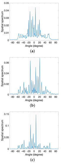 Estimated spectra for moving sources using method in [34]. (a) Initial position. (b) Next position from (a). (c) Next position from (b).