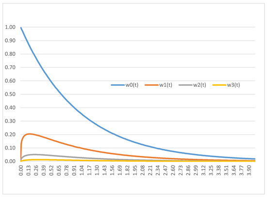 Before starting the calculation of the sequence of functions defined by Equation (15), we obtain the values of the functions and for all where is an integer, h is the step of the trapezoid method, . The results are written in two arrays and , where and . In computer realization we use a one-to-one relation between the real numbers and the integer array indexes.