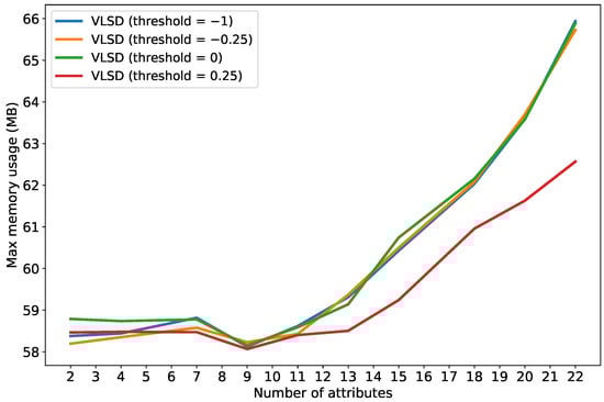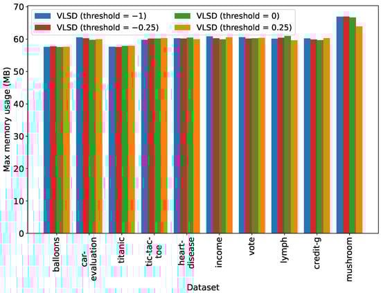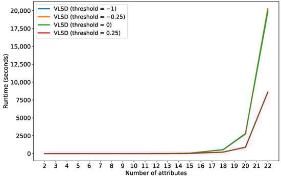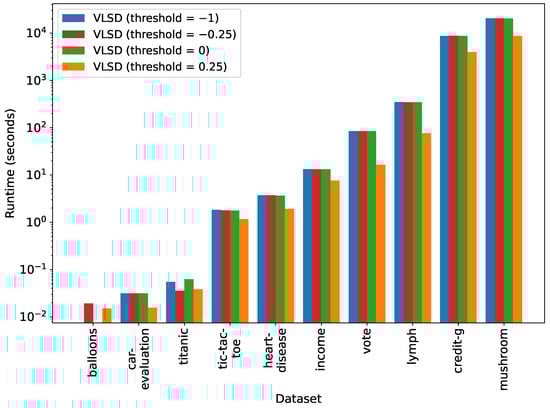 The objective of these experiments was to test the performance of the VLSD algorithm with respect to some other well known state-of-the-art Subgroup Discovery (SD) algorithms. All experiments were implemented using a computer with an Intel Core i7-8700 3.20 GHz CPU, 32 GB of RAM memory, Windows 10, Anaconda3-2021.11 (x86_64), Python 3.9.7 (64 bits) and the following python libraries, pandas v1.3.4, numpy v1.20.3, and matplotlib v3.4.3. We used these python libraries because they are a reference in the Machine Learning field and they have been very used and tested by the community. Moreover, our proposal was implemented in subgroups python library (Source code available on: https://github.com/antoniolopezmc/subgroups, accessed on 24 May 2023).