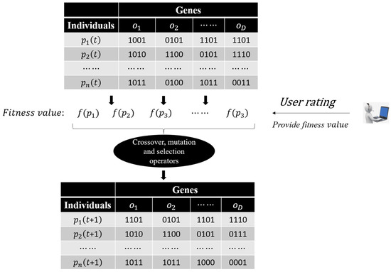 Early IEA applications were mostly implemented using interactive genetic algorithms [23,24,25], individual evaluation scores are given by users as a bridge to interact with the algorithm [26]. The iterative process of the algorithm is shown in Figure 1. Evolutionary individuals are provided by the interactive interface in explicit form for users to score, using a purely numerical or hierarchical system. The disadvantage of this evaluation method is that the scores given by users can only be relative results which need to be mapped to absolute fitness values, increasing the complexity of the algorithm.