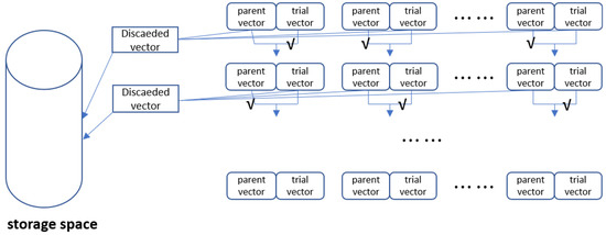 As the greedy selection operator performs well when individuals do not fall into local optimum, greedy selection operator is used when individuals do not fall into local optimum, a new selection operator based on backtracking strategy is used when the individual falls into the local optimum. The first step is to determine whether the individual is trapped in a local optimum. An individual is considered to be in a stagnant state when its data is slowly updated within a certain range [34]. Although this method may have a subtle failure rate, it is an effective way to determine whether a target individual is stuck in a local optimum, and a strategy can be developed to reduce the impact of misclassification. The new selection operator borrows the idea of the backtracking algorithm, as shown in Figure 3. A spatial warehouse is set up at each iteration to store the individuals Rx (x denotes the number of layers of the current iteration) that failed to compete and were discarded in this round of comparison. When an individual is detected to be trapped in the local optimum at iteration y, vectors Ry−1, Ry−2, and Ry−3 are successively removed from the storage space and one of them is randomly selected to survive to the next generation, and if the individual still does not jump out of the local optimum, vectors Ry−4, Ry−5, and Ry−6 are successively removed from the storage space and removed from [Ry−1, Ry−2, Ry−3, Ry−4, Ry−5, Ry−6] to choose a random vector to survive to the next generation, and so on. If the parent vector is replaced with a randomly generated vector, it is difficult to guarantee the adaptation value of the random vector and the adaptation value must be calculated, which increases the computational complexity. Therefore, replacing the parent vectors with discarded trial vectors is considered. Since these discarded trial vectors are not passed on to the next generation, individuals evolving based on these vectors are more likely to help individuals jump out of local optima, and Figure 4 shows the complete iterative process of the algorithm. where √ represents the better individual who wins in each selection.