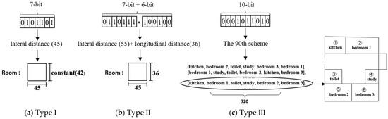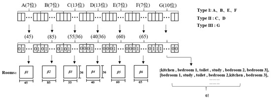 There are many encoding forms of chromosomes in differential evolution algorithm [38]. In this paper, binary coding is adopted, and the parameters of distribution space are expressed in the form of chromosome bit string based on character set {0,1}. In this paper, taking block diagram ④ as an example, the plan is divided into seven parts: room β1–β6 and information of distribution location of each room, the chromosomes of the population are composed of the coding arrangement of all variables (as shown in Figure 5), A-F correspond to 6 rooms respectively, and G represents the position information of their arrangement. The process of gene corresponding to individual is explained in detail (Figure 6). When generating and arranging rooms, the proportion needs to meet certain constraints, but this relationship is by no means specific, and can only be determined according to the design style, room type and user requirements. The result of this algorithm is only the preliminary blueprint of the design, which provides the possibility for users and designers to discuss. Therefore, there may be small errors between the parameters and the actual situation.