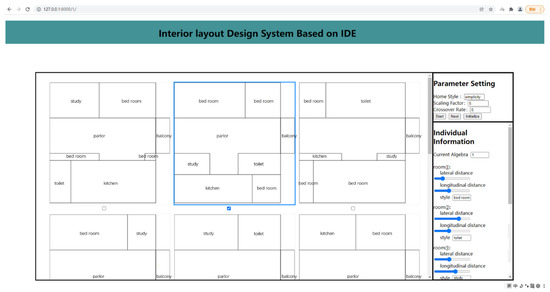 The user interaction interface is shown in Figure 7. According to the principle of simplicity and ease of use the interface can be roughly divided into three parts, the left part is the dominant display of individual genes of the population, from which the user can observe the individuals generated by each iteration of evolution and score them to give adaptation values, the upper half of the right part is the parameter setting area, where the user can adjust parameters such as algorithm crossover and variation probability by himself before the algorithm starts, and select the suitable furniture style, the lower half of the right half of the right side is the individual genetic details, you can select a layout drawing in the left population, and the detailed parameters of the drawing’s room will be displayed on the interface. When the experiment starts, first enter the interface, the user selects the item “home style” in the parameter setting section, such as “Simplicity”, “European”, etc. Afterwards, the user can modify the values of the scale factor (default 0.65) and cross ratio (default 0.2) according to their wishes, and click the “Start” button. Wait until the initial population is generated on the left interface, then the user selects the individual, checks the detailed parameters of the individual and clicks the “Next” button. The algorithm evolves itself to generate the next generation of populations according to the user’s choice, and so on, until we get a layout map that matches the user’s subjective preference.