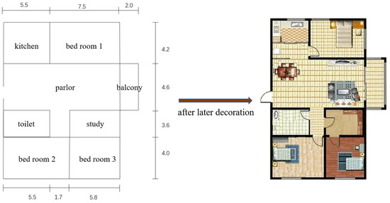 Interior layout refers to the overall framework of the house and the internal space distribution, usually based on the external overall framework fixed in the case of interior design. At different stages of family development, the composition of family members and living functions are characterized by stages [37]. According to the research results, the number of family members and space demand of current home buyers are shown in Table 1. According to the structural design of the house, the house type map presents a variety of forms, which can be divided into one-bedroom, two-bedroom, three-bedroom, multi-bedroom, etc. Table 2 shows a schematic representation of the different types of frameworks.