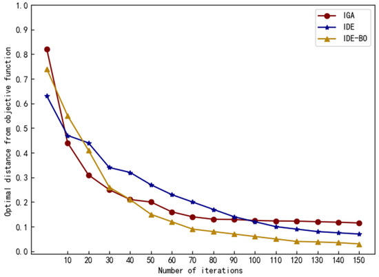 Table 3 shows the number of iterations required to reach convergence for IDE-BO and the other two traditional algorithms in 10 simulation experiments, and it can be seen that IDE-BO has reached the convergence condition most of the time at around t = 125, while the number of iterations required to reach around 133 in IDE. Although IGA can converge significantly faster than IDE-BO, its convergence is not good as can be seen in Figure 11. To statistically compare the performance difference in convergence speed between IDE-BO and its competitors, a Wilcoxon signed-ranks test with a 0.05 significance level is conducted. Table 4 shows the p-values of the results when comparing IDE-BO with the other two algorithms. From the table, it can be seen that the p-value of IDE-BO is much lower than 0.05 for IDE which has a small difference in convergence and has a much better convergence than IGA which has a faster convergence. In general, the performance difference between IDE-BO and the other two algorithms is significant.