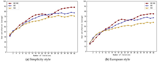 It can be seen from the Figure 12 that the three algorithms have no obvious effect on the result when the iteration number t ∈ [0,12]. When t > 14, IDE will show stronger convergence than IGA, and the improved IDE is easier to jump out after falling into local optimization, so it will have higher satisfaction in the end. At the same time, we know that different subjective needs of users will have an important impact on the convergence of the algorithm, and different style choices will also have an impact on users’ subjective judgment, and then affect the convergence of the algorithm. In this test, compared with “Simplicity”, the word “European” has more complex meaning and thinking, which is difficult for users to judge. Therefore, the “Simplicity” style shows better results.