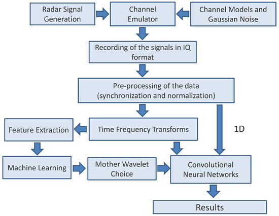 The structure of this paper is the following: Section 2 provides a review of the relevant literature in this field. Section 3 describes the overall methodology of the proposed approach. Section 4 describes the test bed used to generate the signals and the different fading conditions. Section 5 describes the architecture of the CNN and the main hyper-parameters used in the classification and their range. Section 6 describes the different TFTs used to convert the processed signals in images. Section 7 provides the results on the evaluation of the proposed approach on the signals described in Section 4. Finally, Section 8 provides the conclusions of this study and future developments.