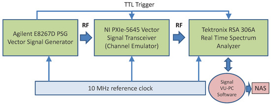 The test bed for the generation of the signals used in our analysis is described in Figure 2. This is a conducted test bed connected with RF cables. The entire set-up was properly calibrated, and the loss of the RF equipment (e.g., RF cables and adapters) was recorded and considered in the measurement and data collection phases. The testbed is composed of the following laboratory equipment: