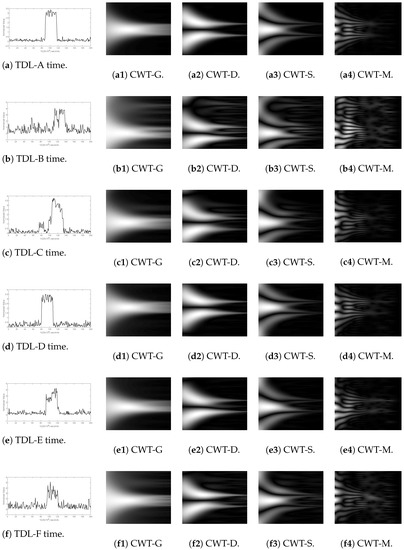 The visualization of one sample of each of the 6 different fading conditions and the related CWT transform is shown in Figure 3, where it can be seen that some representations are similar (e.g., TDL-E, TDL-F) from a visual point of view (this will also be assessed in the Section 7).