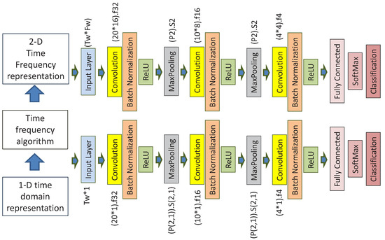 The architectures for the CNN implementation for the time–frequency input and the 1D time domain input are shown in Figure 4. An architecture with 3 convolutional layers was identified to be the optimal architecture across the time–frequency representations and 1D representation as discussed in Section 7. The 1D time-domain representation was also directly used as an input to a 1D CNN for comparison with the TFTs approach. Then, different TFTs were applied to the 1D time-domain representation to produce 2D representations (i.e., grayscale images), which are fed to the CNN. While the adopted CNN architecture is canonical, there are different hyper-parameters (e.g., solver algorithm) whose impact has been evaluated on the classification performance measured in terms of accuracy (see the end of this section for the definition of the evaluation metrics). The number of epochs was set to 40.