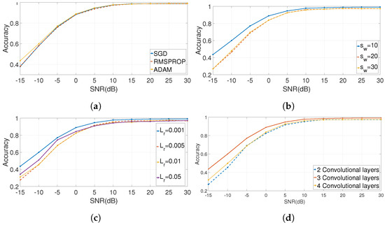 Figure 5a shows the accuracy trend for different values of SNR in dB. It can be seen that the use of the Adam solver algorithm has a similar performance to the RMSProp and the SGDM, but it is slightly more robust for lower values of SNR in dB.