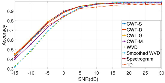 In particular, the results presented in this paper show that the CWT with different mother wavelets provides the best performance in terms of accuracy among the different time–frequency representations for different values of SNR in dB. On the other hand, the choice of the mother wavelet remains a challenge because different mother wavelets offer different performances for the various values of SNR. The optimization of the optimal mother wavelet could be computing demanding using approaches where the CNN classification has to be executed for each mother wavelet as in [14]. In some cases, authors select a specific wavelet in combination with CNN as in [12], where the Morlet wavelet is used for a similar problem, but then the opportunity to select the optimal wavelet is waived. Then, this paper proposes a novel approach where the mother wavelet is chosen in a pre-processing step based on feature extraction and shallow machine learning algorithms, which allows the selection of the optimal or quasi-optimal mother wavelet for the application of CNN.