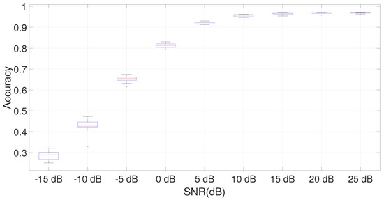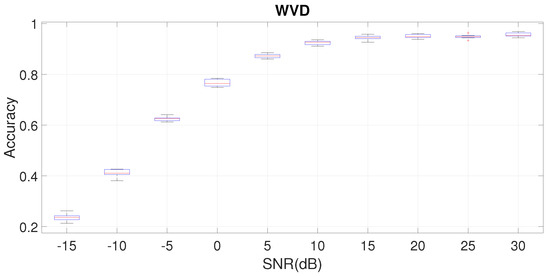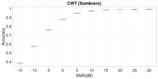 In a similar way to what was shown in the previous Section 7.2, we also present the box plot of the accuracy for one time–frequency (CWT-G) with CNN. We choose this mother wavelet because it provides superior performance for DIFFSNR to the other MWs. Figure 13 shows that the variability (i.e., the standard deviation of the distribution of the results) in the DIFFSNR method is slightly larger than in the SAMESNR method. This is also to be expected because the structure of the data can be quite different in the training data set taken at SNR = 30 dB and in the testing data sets at different values of SNR.