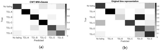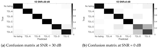 Figure 14a,b show the confusion matrices obtained using the CWT-G at SNR = 0 dB and the 1D or Original time representation. It can be seen that we obtained similar results for the DIFFSNR method as in the SAMESNR method. The TDL-D and TDL-E fading conditions are more difficult to distinguish. At the same SNR, the application of CNN with the original time representation is much worse than the combination of CWT MW = Gaussian and CNN because there is a relevant number of FP and FN for all the fading conditions.