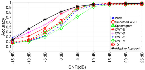 Figure 11 shows the performance obtained for different values of SNR in dB for the adaptive method using the Decision Tree (DT) algorithm. It can be seen that the adaptive approach is able to select automatically the optimal or the quasi-optimal MW for each value of SNR in dB. The algorithm fails to find the optimal value in the presence of strong noise at SNR = −15 dB, presumably because the fading conditions are so obscured by the noise that the information on the optimal wavelet is basically lost. On the other hand, at SNR = 15 dB, no TFT combined with CNN is able to classify the fading channels correctly, and most of them achieve an accuracy, which is barely above the random choice (which is accuracy = 1/6 or 0.1(6)). The optimal performance is obtained with the CWT-G and secondly with CWT-S and CWT-D. This is also expected because these wavelets are the ones that are more similar to the original pulse-like weather radar signal. On the other hand, the impact of the fading channel conditions is able to distort such pulse-like signal, which is the reason why no approach is able to obtain the perfect classification accuracy of 100 even at SNR = 25 dB.